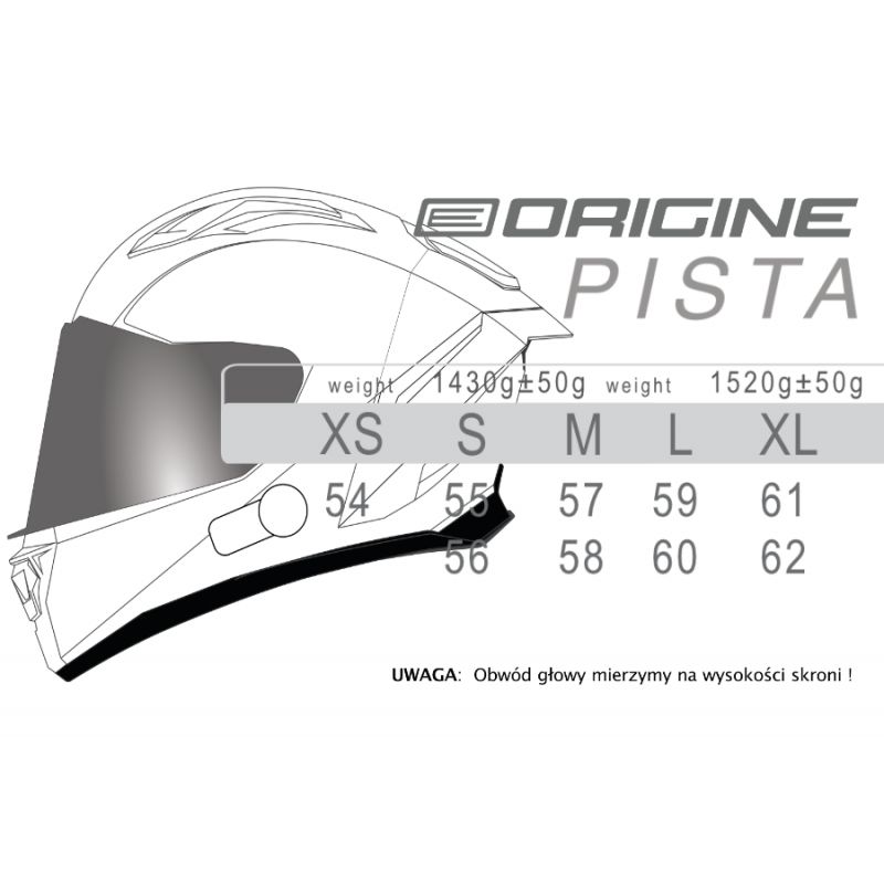Kask Origine PISTA MESH sprawia, że każda podróż jest w pełni komfortowa i przyjemna. Kask PISTA wyposażony jest w ulepszony system wencylacji poprzez dokładany spojler zainspirowany moto GP. Dzięki temu kask znacznie lepiej odprowadza powietrze przy dużych prędkościach. Nowy system komunikacji BLiNC™ Bluetooth gwarantuje doskonałą jakość dźwięku i pełen komfort zarówno podczas rozmów przez interkom ze swoim pasażerem czy innym motocyklistą jak również podczas korzystania z funkcji telefonu. Wykonywanie połączeń telefonicznych, słuchanie muzyki czy otrzymywanie poleceń nawigacji jest niezwykle przyjemne dzięki systemowi cyfrowej redukcji szumu, który skutecznie zmniejsza zakłócenia spowodowane wiatrem czy dźwiękiem silnika. Aby zminimalizować zjawisko parowania wizjera kask został wyposażony w deflektor. Komfort podczas jazdy w upalny dzień zapewniają zintegrowane wloty powietrza, które można regulować. Mikrometryczne zapięcie pozwala w bardzo łatwy sposób odpiąć i zapiąć kask także w rękawiczkach motocyklowych. Aby utrzymać kask w czystości posiada całkowicie wyjmowane i przystosowane do prania wnętrze. PISTA posiada europejską homologację ECE 22-06 co gwarantuje wysoki poziom bezpieczeństwa.