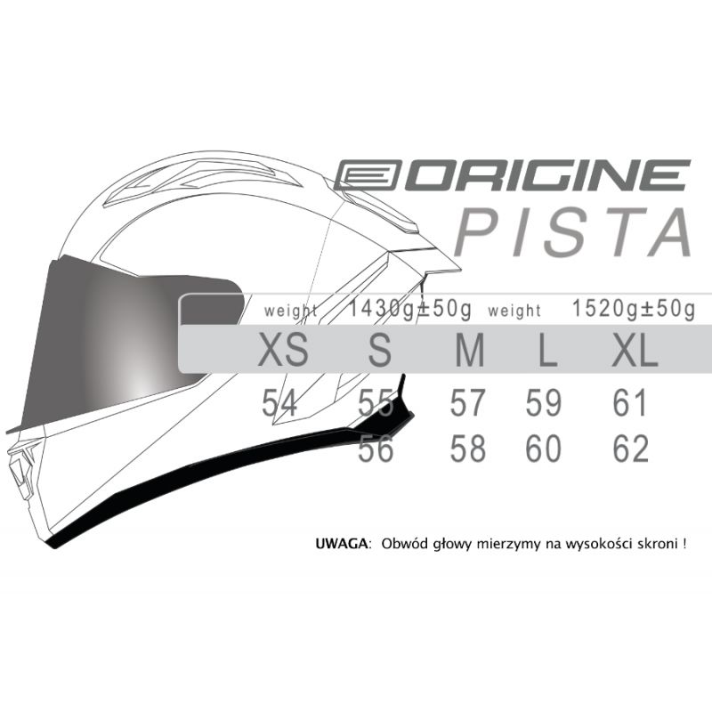 Kask Origine PISTA sprawia, że każda podróż jest w pełni komfortowa i przyjemna. Aby zminimalizować zjawisko parowania wizjera kask został wyposażony w deflektor. Komfort podczas jazdy w upalny dzień zapewniają zintegrowane wloty powietrza, które można regulować. Mikrometryczne zapięcie pozwala w bardzo łatwy sposób odpiąć i zapiąć kask także w rękawiczkach motocyklowych. Aby utrzymać kask w czystości posiada całkowicie wyjmowane i przystosowane do prania wnętrze. PISTA posiada europejską homologację ECE 22-06 co gwarantuje wysoki poziom bezpieczeństwa.